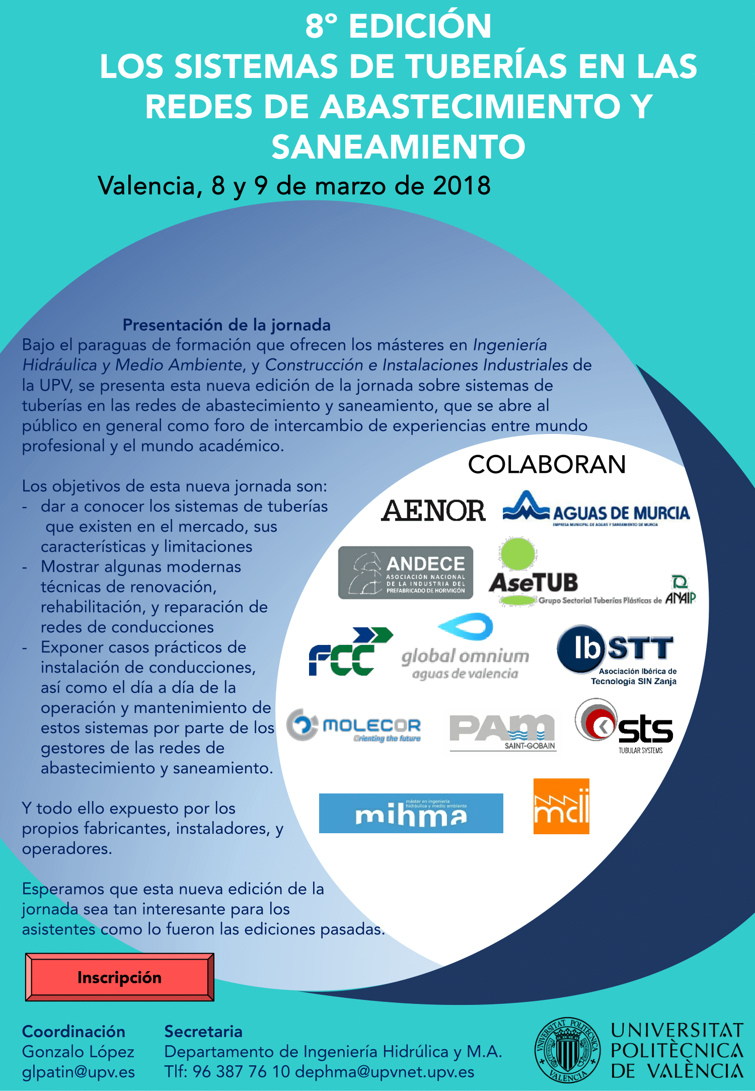Los días 8 y 9 de marzo de 2018 se celebrará en Valencia  esta nueva edición de la jornada sobre  sistemas de tuberías en las redes de abastecimiento y saneamiento.