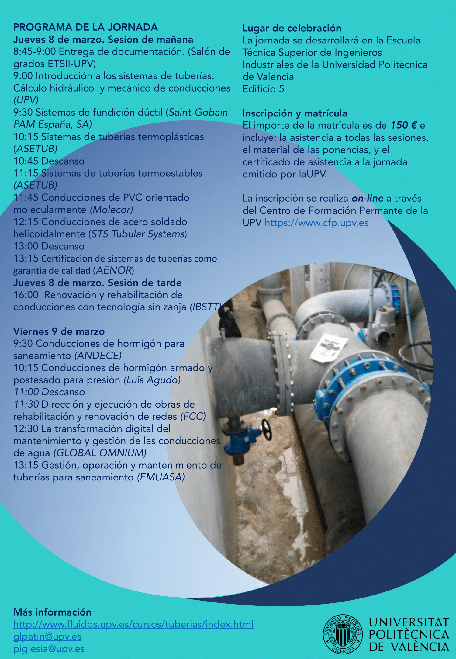 La jornada, además de ser un foro de intercambio de experiencias entre   el mundo profesional y académico, tiene como objetivos dar a conocer los sistemas de tuberías disponibles en el mercado, mostrar técnicas de reparación, rehabilitación y reparación de redes de conducciones así como  presentar  casos prácticos de instalación de conducciones y su mantenimiento por parte de los gestores de las redes de abastecimiento y saneamiento. Sin olvidar que la jornada  se enmarca dentro la formación que ofrecen los másteres en Ingeniería Hidráulica y Medio Ambiente, y Construcción e Instalaciones Industriales de la UPV.