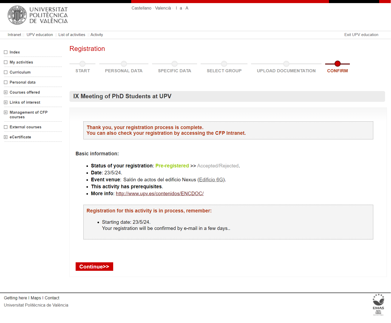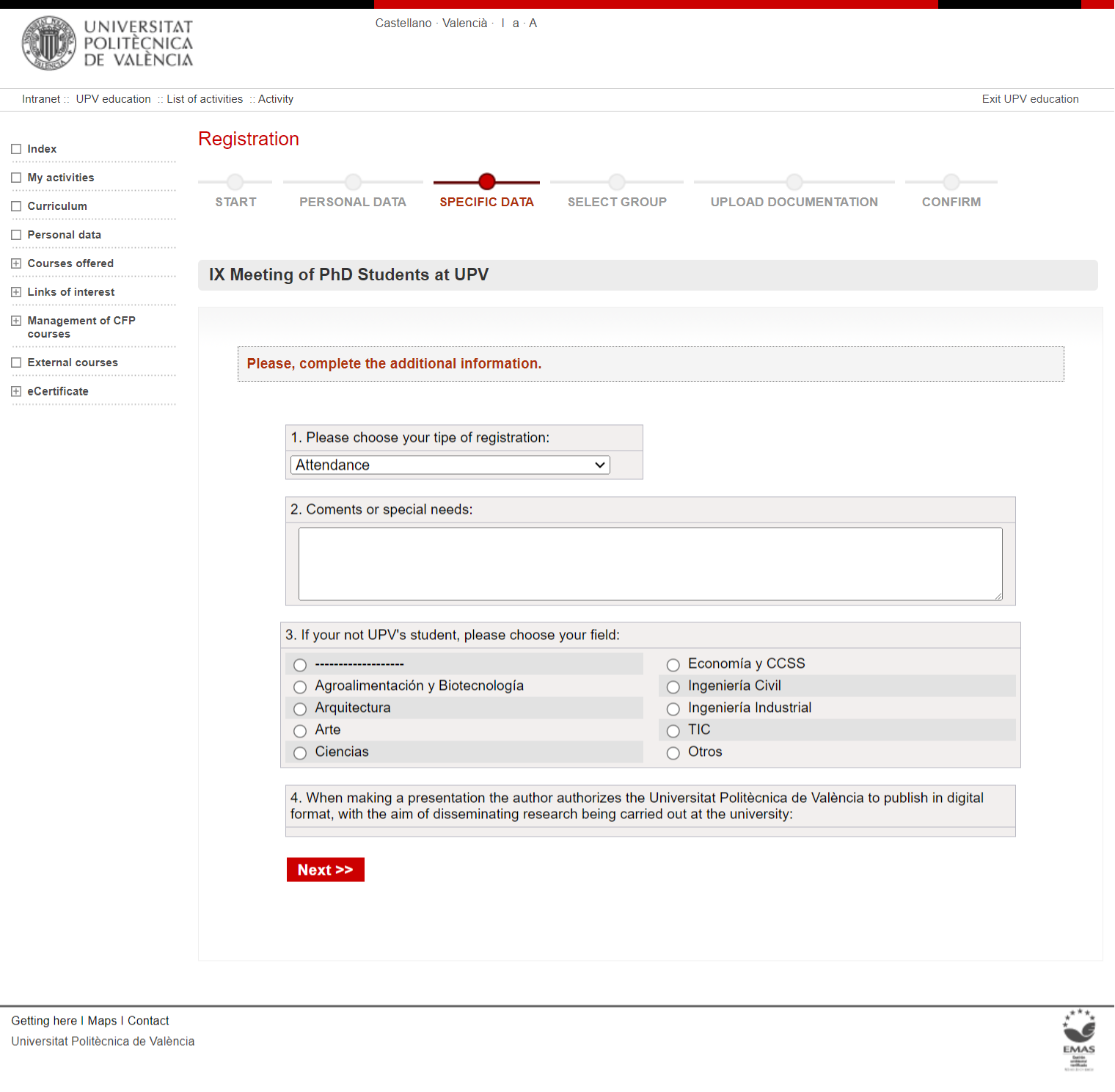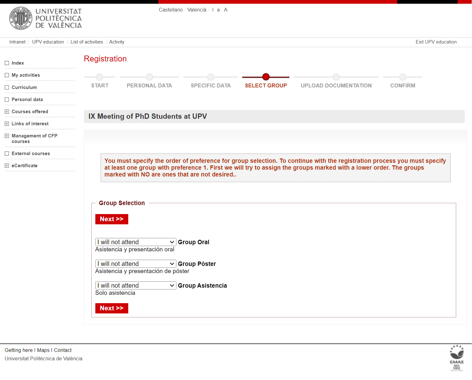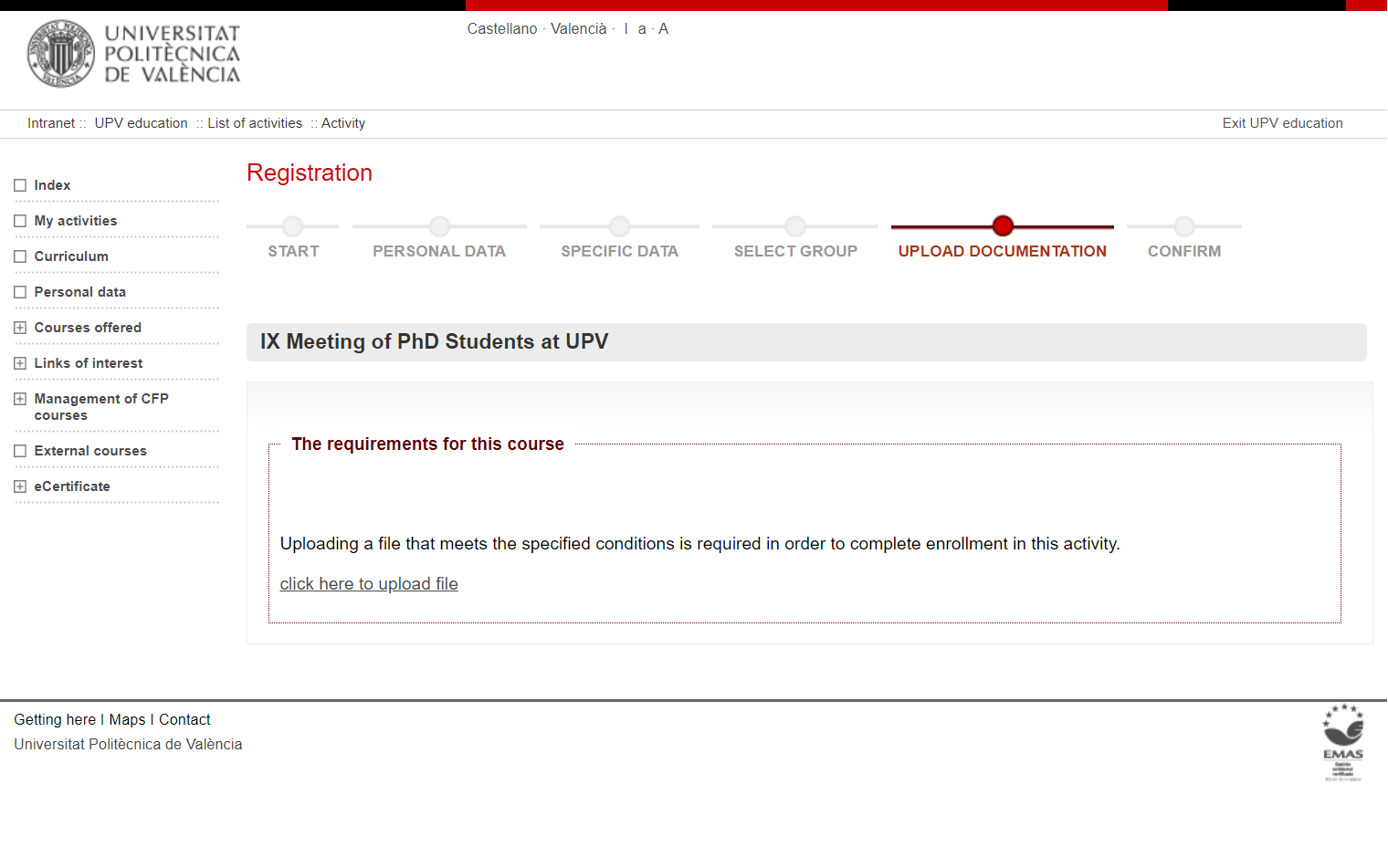 We recommend you to be validates through UPV Intranet before starting with the registration. If you are not, you will find the following screen: