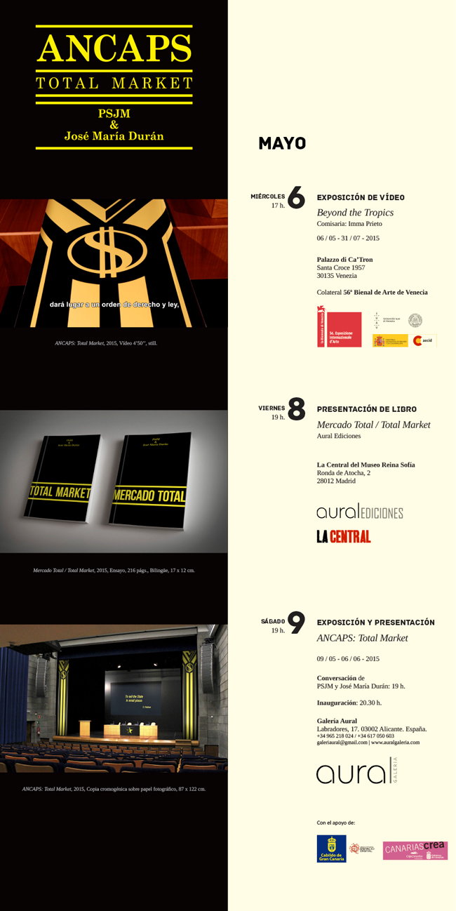 La Galería Aural presenta el último trabajo de PSJM. Para esta ocasión, el colectivo residente en Berlín ha contado con la colaboración del investigador y teórico José María Durán. El proyecto ANCAPS: Total Market se presentará previamente en la Bienal de Venecia 2015, en el marco de la exposición Beyond the Tropics, comisariada por Imma Prieto para el programa oficial.
