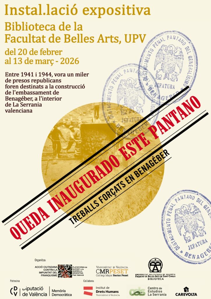 - Instalación Expositiva: Queda inaugurado este pantano, trabajos forzados en BenagéberLa exposición se compone de 20 paneles que muestran cómo se construyó el embalse de Benagéber, que comenzó en 1932 siendo el pantano de Blasco Ibáñez y que en 1941 pasó a denominarse del Generalísimo, incorporando a las obras a presos… Lee más: Instalación Expositiva: Queda inaugurado este pantano, trabajos forzados en Benagéber