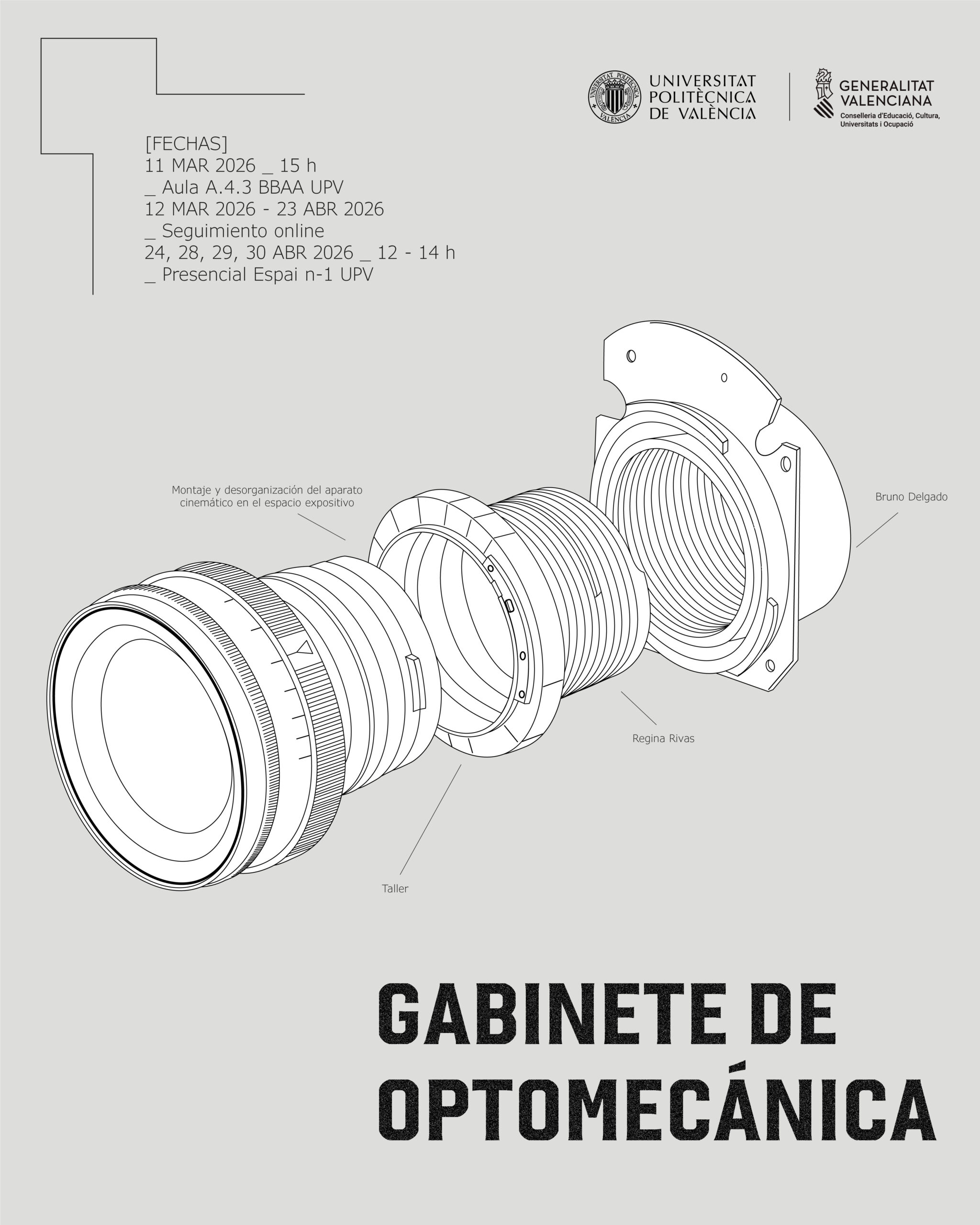 El taller Gabinete de optomecánica. Montaje y desorganización del aparato cinemático en el espacio expositivo se desarrolla en torno a la exposición La raya verde, de los artistas Bruno Delgado Ramo y Regina Rivas Tornés. Invitamos al alumnado a participar trayendo aparatos optomecánicos, desde proyectores de Super-8 mm o proyectores de diapositivas hasta juguetes relacionados con la óptica o el cine, ya sea de uso propio, familiar o adquiridos de segunda mano, para disponerlos en el espacio y experimentar con ellos. El objetivo es trabajar sobre estas máquinas y explorar nuevos usos posibles.