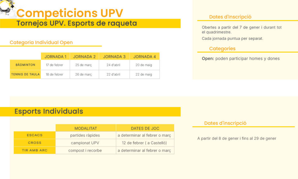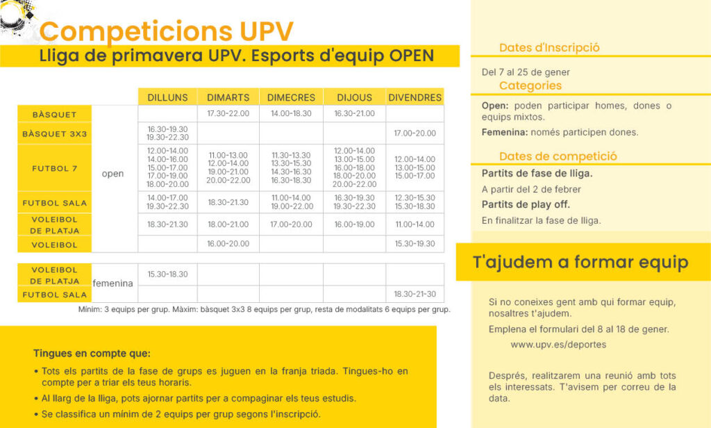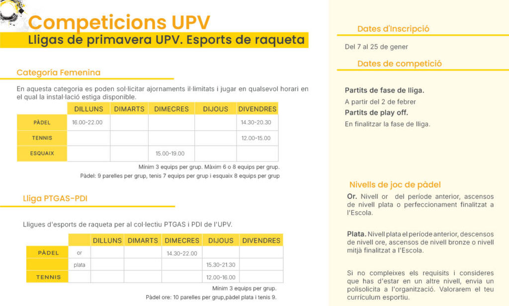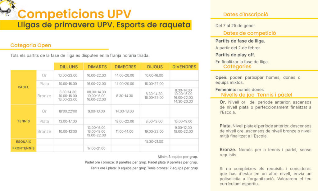 Lligues i Tornejos del Campus de Vera en l’oferta d’hivern, de primavera o d’estiu.