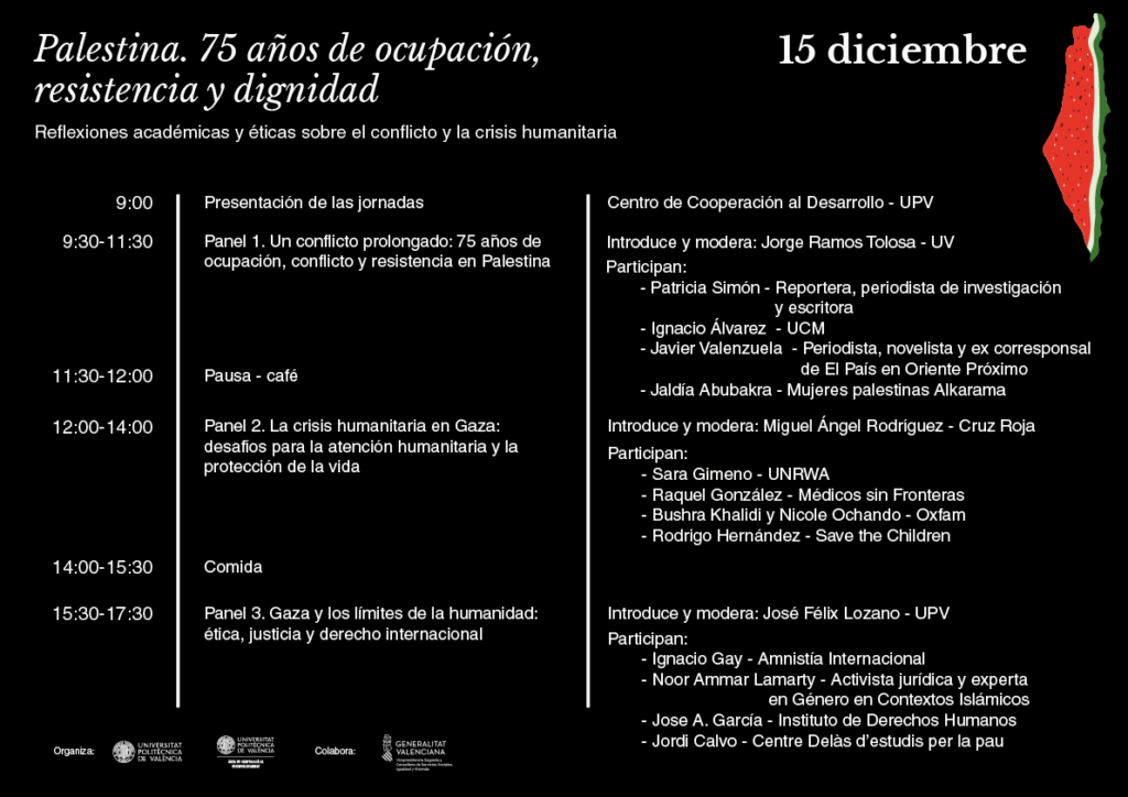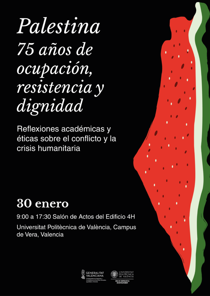 Organizada por el Centro de Cooperación al Desarrollo de la Universitat Politècnica de València, la jornada tiene el propósito de generar un espacio de reflexión crítica, diálogo académico y compromiso ético ante la prolongada crisis que vive el pueblo palestino y, en particular, la población de la Franja de Gaza.
