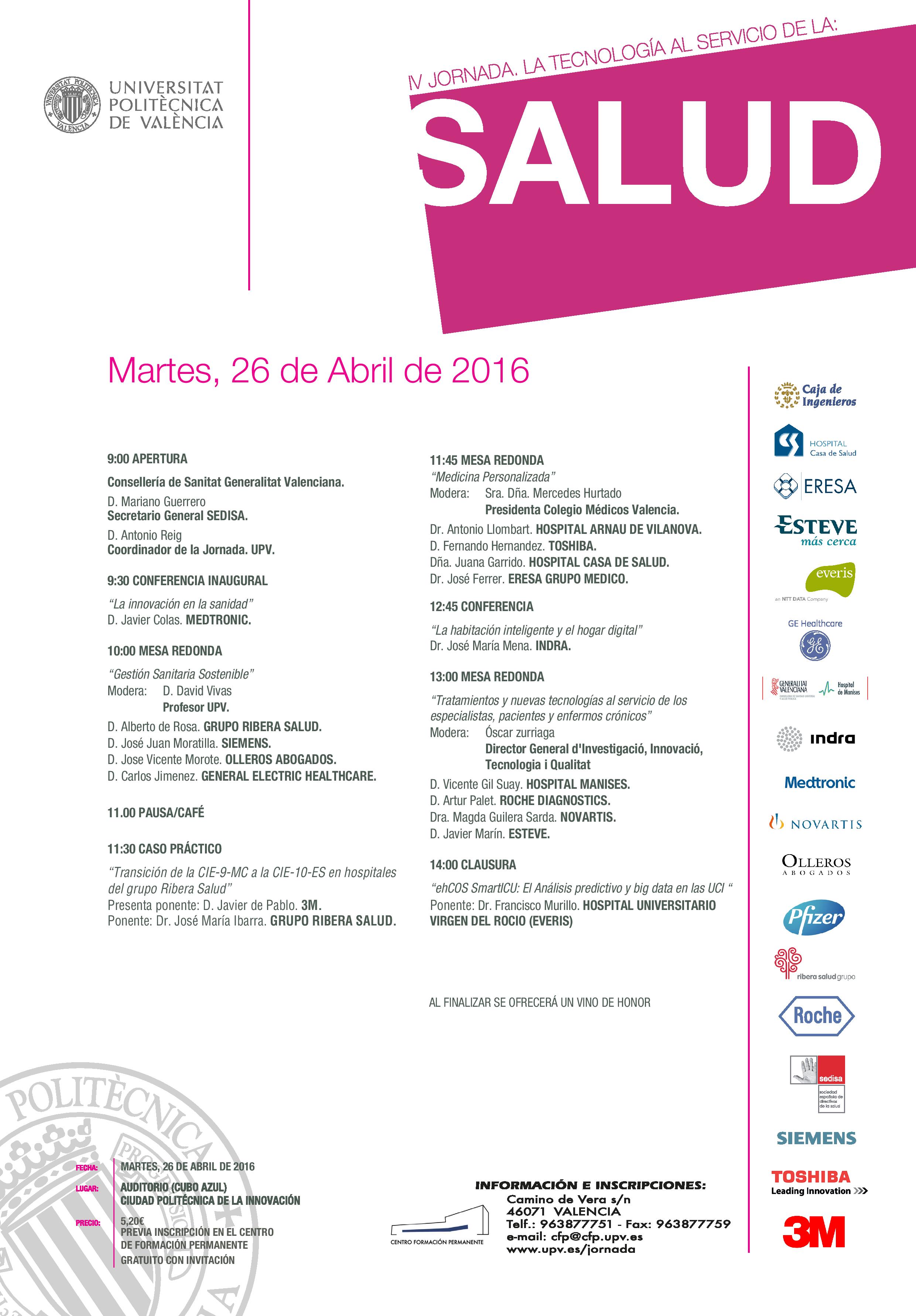 INVITACION IV Jornadas sobre Tecnología al servicio de la Salud, UPV 26 ABRIL Publicado el 22 de abril de 2016 en Otros Compartir : Compartir Facebook Compartir Twitter Compartir Linkedin Compartir Pinterest